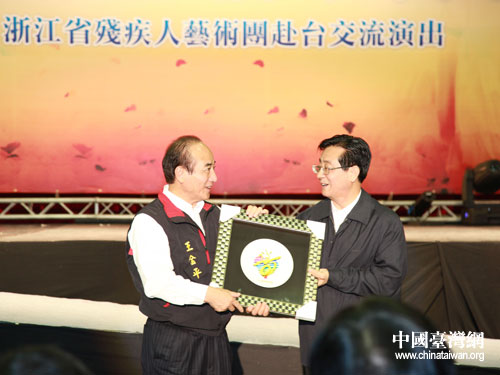 臺灣無障礙協會名譽理事長王金平向趙洪祝贈送紀念品。(浙江臺辦王健 攝)