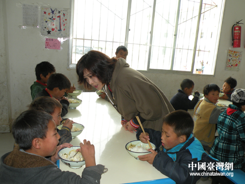 張平宜在學生餐廳陪著孩子們用餐(圖片來源:四川省臺辦)