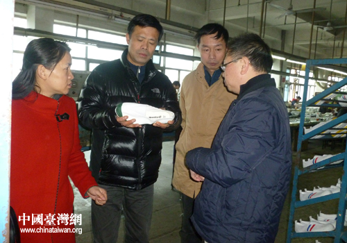 陳推一行在臺(tái)企寶峰鞋業(yè)公司視察。(圖片來源:黃石臺(tái)辦)