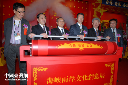 北京市貿促會副會長佘運高先生,北京市人民政府對外事務辦公室副主任李洪海先生,北京市文化創(chuàng)意產業(yè)促進中心副主任吳錫俊先生,臺灣對外貿易發(fā)展協會副秘書長黃文榮先生,臺北市文化局局長、臺北文化基金會執(zhí)行長劉維公先生,臺灣創(chuàng)意設計中心副執(zhí)行長黃振銘先生共同為2012海峽兩岸文化創(chuàng)意產業(yè)展揭幕。(圖片來源:北京市臺辦)