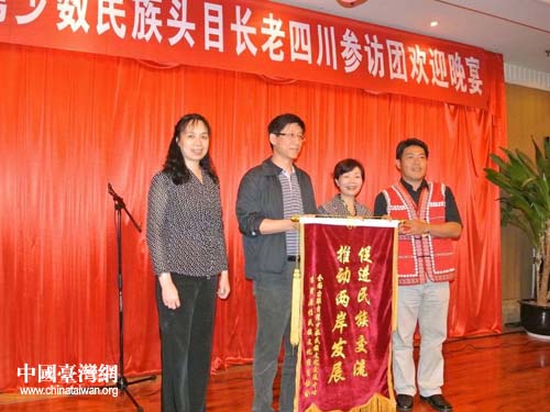在歡迎晚宴上,全國臺聯臺灣少數民族文化交流中心和臺灣原住民族文化經貿協會還向四川省臺聯贈送了“促進民族交流、推動兩岸發展”的錦旗,感謝四川有關方面在推動兩岸少數民族交流交往中所作的貢獻。