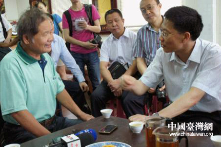 四川省委常委、副省長(zhǎng)鐘勉(右一)在臺(tái)灣桃園縣龍?zhí)多l(xiāng)參觀考察,與三水村茶農(nóng)廖文金(左一)拉家常。