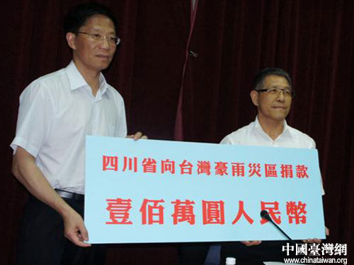中國(guó)臺(tái)灣網(wǎng)6月24日臺(tái)中消息 6月22日,受中共四川省委書記劉奇葆、省長(zhǎng)蔣巨峰委托,正率四川農(nóng)業(yè)交流團(tuán)在臺(tái)灣參訪的中共四川省委常委、副省長(zhǎng)鐘勉來(lái)到位于臺(tái)中市的臺(tái)灣省農(nóng)會(huì),代表中共四川省委、四川省人民政府和9000萬(wàn)四川人民向臺(tái)灣豪雨災(zāi)區(qū)捐款100萬(wàn)元人民幣,用于近期遭遇豪雨和臺(tái)風(fēng)襲擊,遭受重大損失的農(nóng)村和農(nóng)戶賑災(zāi),委托臺(tái)灣省農(nóng)會(huì)具體實(shí)施。