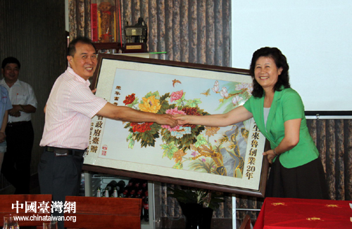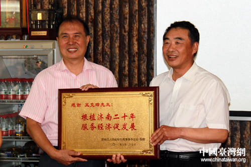 濟南市臺辦主任李元東祝賀王克璋先生二十年來在濟南特別是大自然公司在濟陽取得的業績。他說,王克璋先生作為濟南市臺協會創會會長,任職12年中積極服務會員臺企,為團結臺商,促進濟臺交流合作做出了寶貴貢獻。李元東主任代表濟南市臺辦向王克璋先生贈送了紀念牌,祝愿在濟陽的企業蒸蒸日上,再創新的業績。