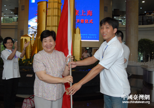 臺聯(lián)會長林明月向營員代表授旗。(上海市臺聯(lián) 朱征宇 攝)