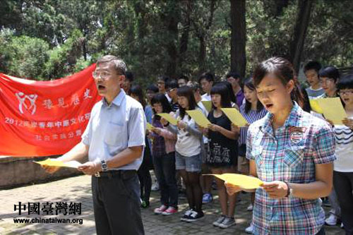 中國臺灣網(wǎng)7月12日平頂山消息 “大江東去,浪淘盡,千古風流人物,故壘西邊,人道是,三國周郎赤壁,……”這不是教室學(xué)生們的讀書聲音,它是兩岸青年學(xué)子在“三蘇墳”前齊誦蘇東坡著名的《念奴嬌·赤壁懷古》。7月11日,2012年“豫見歷史——兩岸青年中原文化研習營社會實踐分營”一行走進平頂山郟縣三蘇園,在這里舉行了一場別具風格的兩岸青年文化交流活動。