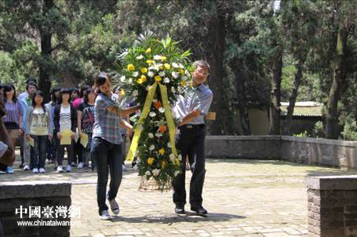 臺灣大學(xué)生領(lǐng)隊向“三蘇墳”敬獻花籃。(圖片來源:河南省臺辦)