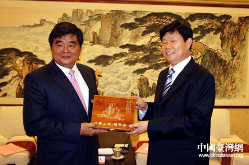 山東省副省長賈萬志會見臺灣省商業總會理事長張榮味一行,圖為贈送禮品。(圖片來源:山東省臺辦)
