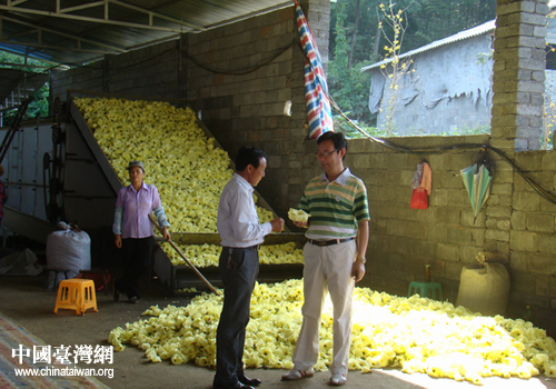 李樹金向縣臺聯(lián)顧問吳政介紹收購黃蜀葵花后集中烘干、銷售情況。(圖片來源:歙縣臺辦)