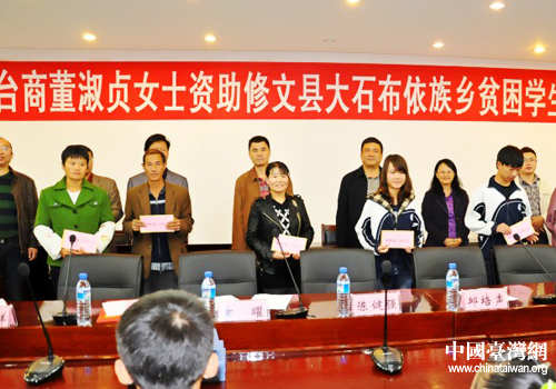 中國臺灣網10月17日修文消息 日前,臺商董淑貞女士資助貧困學生助學金發放暨助學捐款儀式在修文中學舉行。受董淑貞女士的委托,貴州省臺聯會長邱培聲向在該校就讀的修文縣大石鄉優秀貧困學生轉發放助學金2萬元。