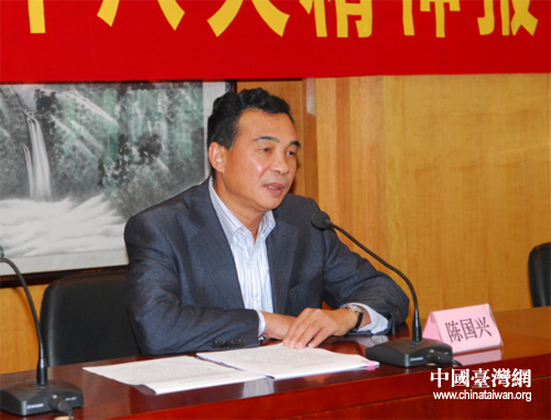 廣東省臺辦主任陳國興主持會議并傳達黨的十八大精神。(圖片來源:廣東省臺辦)