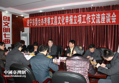 中國臺(tái)灣網(wǎng)12月13日綿陽消息 日前,遂寧市委臺(tái)辦主任唐統(tǒng)一行來綿陽,就綿陽市梓潼文昌文化申報(bào)立項(xiàng)工作及舉辦“海峽兩岸文昌文化交流活動(dòng)”進(jìn)行工作座談和實(shí)地考察。市臺(tái)辦主任陳福林、副主任賀俊,梓潼縣委副書記姜偉、副縣長楊世茹、政協(xié)副主席杜登元及梓潼縣臺(tái)辦、七曲山風(fēng)景區(qū)管委會(huì)、文廣新旅局、民宗辦等有關(guān)部門負(fù)責(zé)同志參加座談和考察交流活動(dòng)。