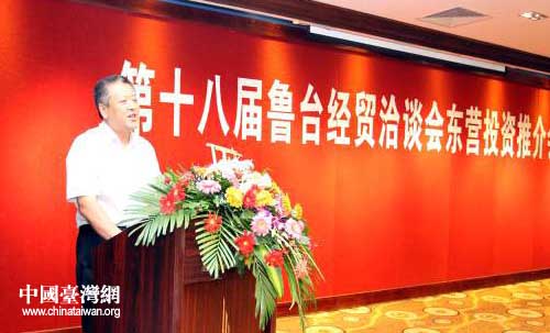 李俊峰副市長(zhǎng)在第十八屆魯臺(tái)經(jīng)貿(mào)洽談會(huì)推介東營(yíng)。(圖片來源:東營(yíng)市臺(tái)辦)