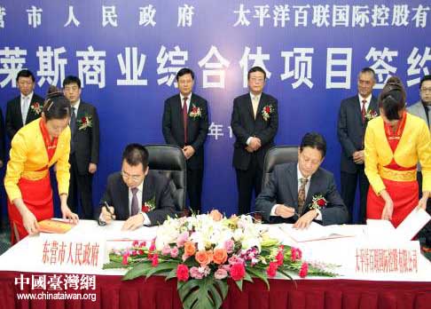 東營(yíng)市人民政府、太平洋百聯(lián)國(guó)際控股有限公司奧特萊斯商業(yè)綜合體項(xiàng)目簽約儀式。(圖片來源:東營(yíng)市臺(tái)辦)