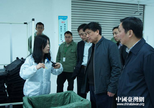 四川省臺辦主任劉俊杰(右三)、巡視員鐘遠超(右一)一行在仁寶成都工廠調研。(圖片來源:四川省臺辦)