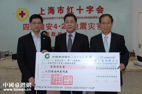 28日下午,上海市臺灣同胞投資企業(yè)協(xié)會會長葉惠德來到市紅十字會,代表上海臺協(xié)廣大會員企業(yè)向四川蘆山地震災(zāi)區(qū)捐贈人民幣100萬元。(上海臺辦 葛鳳章 攝)