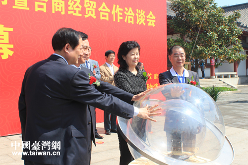 張雪燕與出席開幕式的領(lǐng)導(dǎo)同志和臺商代表共同按下水晶球。(圖片來源:泰安市臺辦)