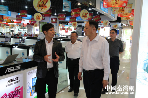 山東省臺辦巡視員張志強在臺資企業百腦匯淄博店考察時與臺商交談。(圖片來源:淄博市臺辦)