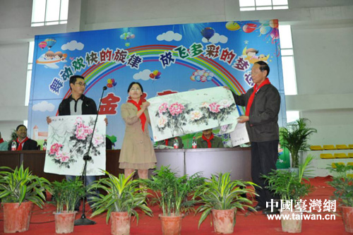 中國臺灣網6月14日廣元消息 四川省廣元市臺辦結合“實現偉大中國夢、建設美麗繁榮和諧四川”主題教育活動,在六一兒童節之際,組織臺屬書畫家7人到昭化區實驗小學,為該校700余名師生送去書畫作品50余幅,著作10本,并與老師同學進行互動交流,談理想、講修養、學技法、習書畫,書畫家們現場為老師同學作書畫100余幅,為實現偉大中國夢鑄造了強大精神動力。