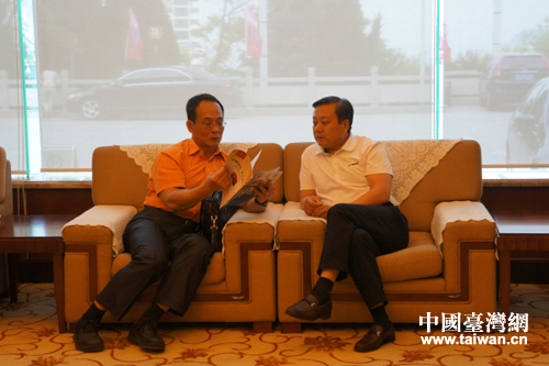 威海市臺辦主任于連波(右一)與臺灣兩岸情經貿交流協會會長王培旺(左一)親切交談。(圖片來源:威海市臺辦)