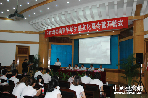 中國臺灣網7月23日合肥消息 7月22日下午,2013年臺灣青年學生徽文化夏令營在安徽建筑大學舉行開營儀式。來自島內7所高校的23名師生將與安徽建筑大學的學生們共同參與此次活動。在皖期間,青年學生將參觀劉銘傳故居、三河古鎮和黃山古徽州村落,觀看徽韻演出,參加有關徽文化及徽派古民居保護的知識講座,開展徽文化知識競賽等豐富多彩的活動。