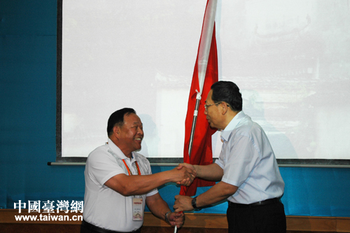 安徽省委副書記李錦斌向夏令營臺灣領隊老師授旗。(安徽省臺辦 裔淳 攝)