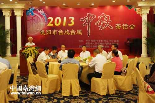 中國臺灣網9月18日德陽消息 9月17日,德陽市臺辦、臺聯會共同舉辦全市臺胞臺屬2013年中秋茶話會,來自縣(市、區)各條戰線的臺胞臺屬代表及縣級臺辦主任、三大廠有關負責人等70余人參加活動。德陽市政協副主席余存貴、市臺辦主任林永成和市臺聯顧問單位負責人出席茶話會,與全市臺胞臺屬代表歡聚一堂,喜迎團圓佳節,暢敘同胞親情,共話兩岸發展。