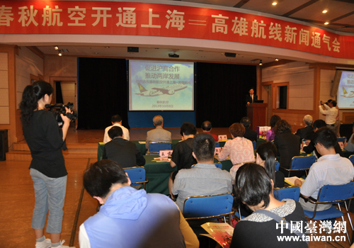 上海市人民政府臺灣事務辦公室巡視員季平,上海市臺灣同胞投資企業協會會長葉惠德、秘書長王躍,高雄市觀光局副局長劉顯惠,春秋航空董事長王正華、春秋航空新聞發言人張武安等兩岸嘉賓及來自兩岸的媒體記者出席了新聞發布會。(中國臺灣網上海臺協通訊員 玉龍)