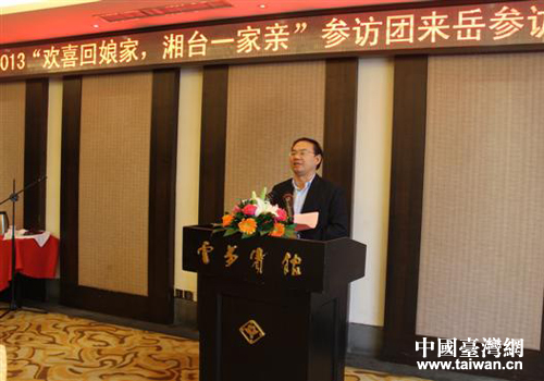 岳陽市委常委、組織部部長、統(tǒng)戰(zhàn)部部長伍國用致辭。(圖片來源:岳陽市臺辦)