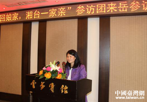 臺灣湖南文獻社社長、本次參訪團領隊黃國暉女士致辭。(圖片來源:岳陽市臺辦)