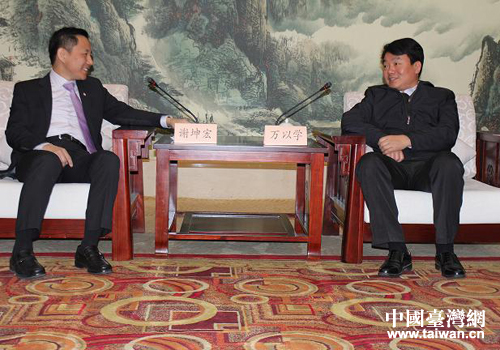 中國臺灣網12月11日淮南消息 12月10日,中國國民黨中常委謝坤宏一行來淮南市交流考察,淮南市委副書記萬以學在洞山賓館會客廳會見了謝坤宏一行。