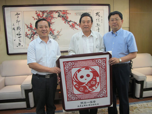 威海臺辦主任于連波向前任海協(xié)會長陳云林贈送“兩岸一家親”刺繡標(biāo)識。左一為于連波主任、中為前海協(xié)會陳云林會長、右一為時任威海劉公島管委會主任袁學(xué)恩(高江濤 攝)