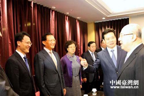青島市委李群書記在臺(tái)北向吳伯雄榮譽(yù)主席介紹青島團(tuán)中的企業(yè)家。(圖片來源:山東省臺(tái)辦)