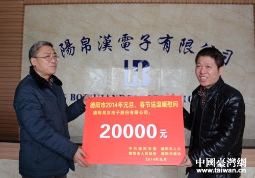 德陽市委常委、副市長何明俊(左)向德陽帛漢電子公司贈送慰問金。(圖片來源:德陽市臺辦)