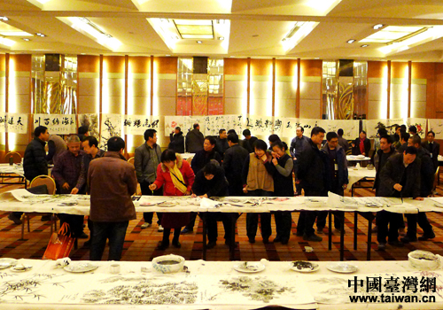 活動現(xiàn)場,書畫名家激情揮墨,為本屆書畫展創(chuàng)作參展作品。張劍波先生創(chuàng)作、趙振川題跋的丈二尺的山水畫《黃河頌歌》,寓意“母親養(yǎng)育情,海峽兩岸頌,匯聚正能量,實(shí)現(xiàn)中國夢”,在現(xiàn)場引起強(qiáng)烈震動,把活動推向高潮。