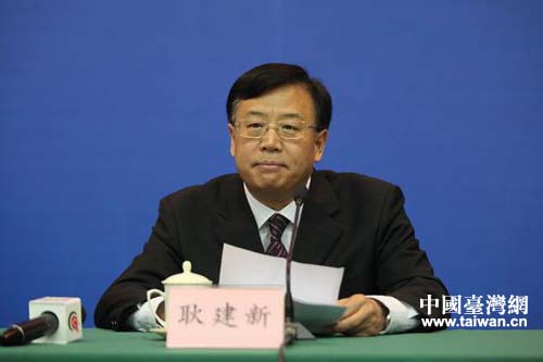 濟南市政府副秘書長耿建新介紹2014山東(濟南)臺灣名品博覽會籌備情況。(圖片來源:山東省臺辦)