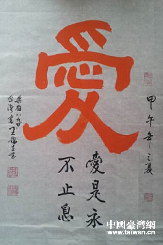 “我感覺自己的書法作品很普通,壓根沒想到在外面還挺有名氣。”王錫圭介紹說,“臺灣成功大學的校長經常找我寫字送人。”“我的字從來不賣,都是送人。我每年在多所學校培訓書法課,遇到青年學生問我求字,我是有求必應。因為書法對我來說是件快樂的事,我從來不用書法換取報酬。當然,有的商人或者老板向我求字后,會給我封個紅包,我也會收,畢竟紙墨都是要花錢買來的嘛。”王錫圭老人總是開朗中透著幽默。