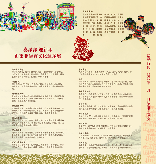 目前,山東入選聯合國教科文組織非物質文化遺產名錄8項,國家級代表性項目名錄173項,省級代表性項目名錄555項,國家級代表性傳承人60名,省級代表性傳承人333名,成為名副其實的非物質文化遺產大省。此次展覽活動由山東省文化廳、山東省臺辦主辦,山東省文化館、中華藝術館承辦。