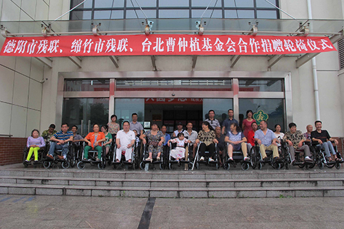 中國臺灣網7月20日四川綿竹訊 日前,臺北曹仲植基金會愛心輪椅捐贈儀式在綿竹市殘疾人康復中心舉行,德陽市殘聯副理事長陳文松、市臺辦紀檢員謝錦輝、綿竹市殘聯理事長劉英出席捐贈儀式。