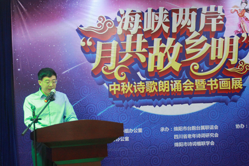 中國臺灣網9月30日四川綿陽訊 “月共故鄉明、兩岸一家親”,9月23日,由綿陽市臺辦主辦,四川省老年詩詞創作研究會、綿陽市臺胞臺屬聯誼會、綿陽市詩詞學會承辦的“月共故鄉明”中秋詩歌朗誦會暨書畫展活動在綿陽市圖書館舉行。綿陽市政協副主席、市委統戰部部長苗平,市政協副主席陳敏出席會議,市臺聯會會長任云、市臺商協會會長林政億以及在綿臺商、臺胞、臺屬代表、省市及各縣市區詩書畫友等200余人歡聚一堂,以詩書畫的方式表達思念島內親人,祈愿祖國和平統一的情感,共慶中秋佳節。
