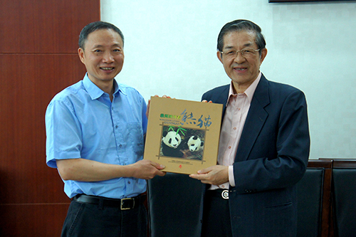 四川省臺辦主任周敏謙(左)向臺灣法學研究交流協會理事長施茂林贈送大熊貓郵冊。