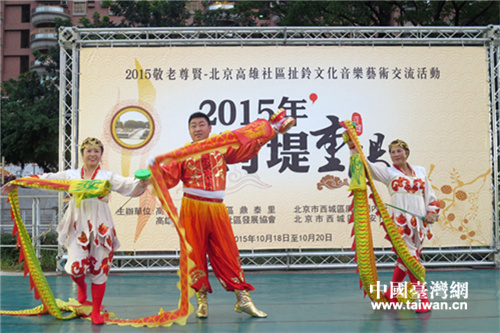 中國臺灣網10月19日高雄訊 (記者 馬一娜)“蟋蟀催寒服,茱萸滴露房。酒巡明燭刻,籬菊暗尋芳。新月和秋露,繁星混夜霜。登高今夕事,九九是天長。”這就是炎黃子孫反復吟誦的重陽節。2015年10月18日,“敬老尊賢——2015重陽節京臺社區扯鈴文化交流藝術節”在臺灣高雄三民區盛裝開幕。