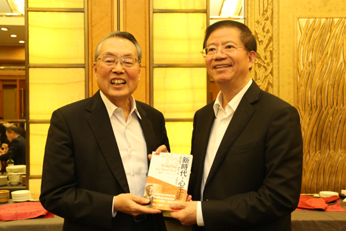 四川省人大常委會副主任彭渝(右)在成都宴見了臺灣嘉賓一行,圖為兩岸創意產業合作論壇籌委會共同召集人、臺灣臺灣文化藝術基金會董事長施振榮先生(左)向彭渝副主任贈送自己的新書。
