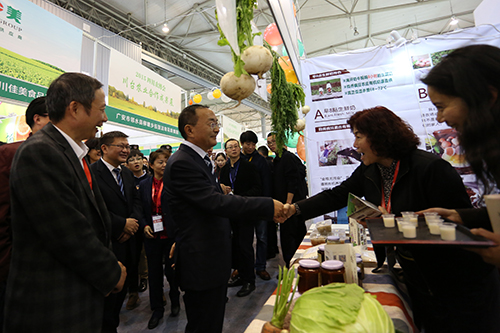四川省委常委、農(nóng)工委主任李昌平(中)巡視第三屆農(nóng)博會(huì)“川臺(tái)農(nóng)業(yè)合作成果展”展區(qū)。圖為:李昌平在成都鈞喬農(nóng)業(yè)科技開發(fā)有限公司展位與臺(tái)商胡淑美交談,了解該公司有機(jī)生態(tài)循環(huán)種養(yǎng)殖及生產(chǎn)經(jīng)營(yíng)情況。