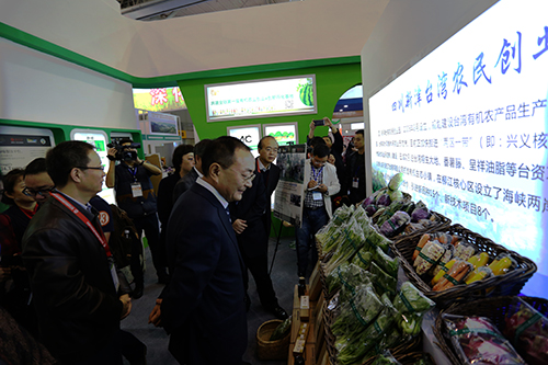 四川省委常委、農(nóng)工委主任李昌平(中)在成都新津臺(tái)灣農(nóng)民創(chuàng)業(yè)園展位察看臺(tái)企翔生公司生產(chǎn)的有機(jī)蔬菜 。
