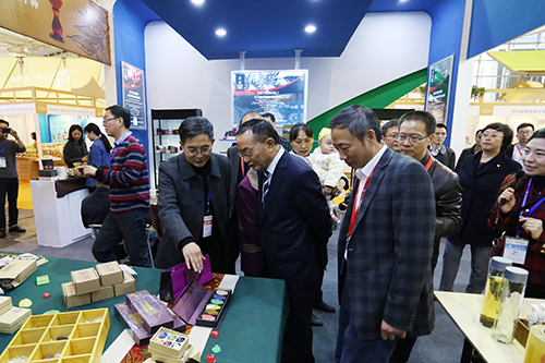 四川省委常委、農(nóng)工委主任李昌平(中)在眉山洪雅圣地農(nóng)業(yè)科技發(fā)展有限公司展位察看該公司生產(chǎn)的蓮花茶等蓮花系列產(chǎn)品。