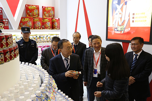 四川省委常委、農(nóng)工委主任李昌平(左三)在旺旺集團(tuán)展位了解該公司展出的系列產(chǎn)品。