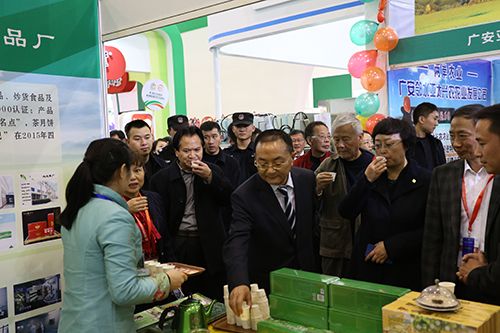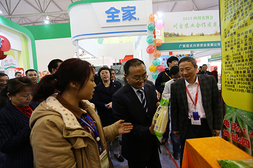 四川省委常委、農(nóng)工委主任李昌平在廣安亞太興農(nóng)農(nóng)業(yè)公司展位了解該公司生產(chǎn)的大米、釀造的米酒等產(chǎn)品情況。