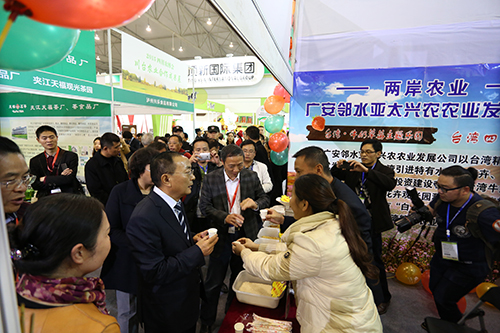 在“川臺(tái)農(nóng)業(yè)合作成果展”展區(qū),李昌平查看了展館布置,聽取了省臺(tái)辦主任周敏謙對(duì)此次川臺(tái)農(nóng)業(yè)合作成果展展覽情況的介紹,先后走進(jìn)成都新津、攀枝花鹽邊兩個(gè)臺(tái)灣農(nóng)業(yè)創(chuàng)業(yè)園以及成都翔生大地、攀枝花干熱河谷、眉山洪雅圣地蓮花、旺旺集團(tuán)、頂新集團(tuán)、瀘州興樂食品、樂山夾江天福茗茶、廣安亞太興農(nóng)農(nóng)業(yè)、廣安伍昱潔奇花異果園、內(nèi)江佳美食品、成都鈞喬農(nóng)業(yè)等在川臺(tái)資農(nóng)業(yè)企業(yè)展位巡察,聽取園區(qū)及參展企業(yè)介紹,詢問各企業(yè)在川投資合作模式、生產(chǎn)經(jīng)營(yíng)情況、特色農(nóng)產(chǎn)品生產(chǎn)銷售情況等,還親自品嘗企業(yè)生產(chǎn)加工的蓮花茶、飲料、米酒、柚子、生態(tài)蔬菜、有機(jī)牛奶等農(nóng)副產(chǎn)品,并祝在川臺(tái)資農(nóng)業(yè)企業(yè)越辦越好。