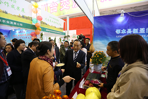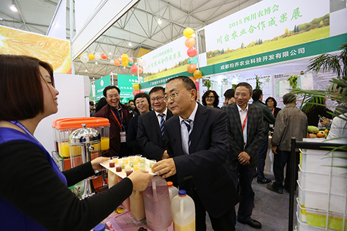 四川省委常委、農(nóng)工委主任李昌平(中)在廣安伍昱潔奇花異果園展位了解該公司生產(chǎn)的柚子、火龍果等農(nóng)產(chǎn)品情況。